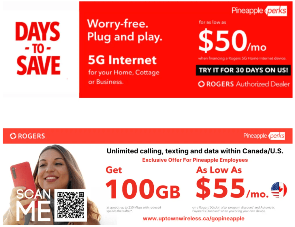 As our dedicated corporate communication service provider, Rogers brings added value to the pineapple family! For as little as $55 per month, indulge in 100 GB of data alongside calling and messaging within Canada & the US. And don’t forget to leverage Rogers’s exclusive referral program, where you can enjoy $50 off your bill!